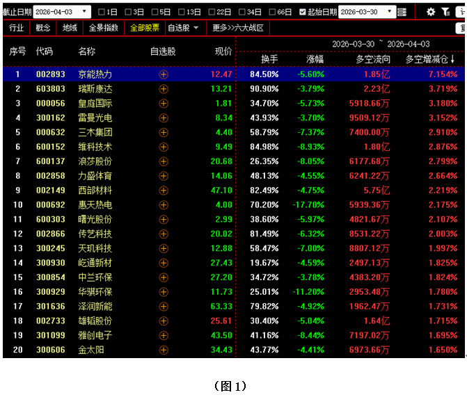 【3月30日至4月3日多空资金增仓前300名中涨幅最小的20只个股】